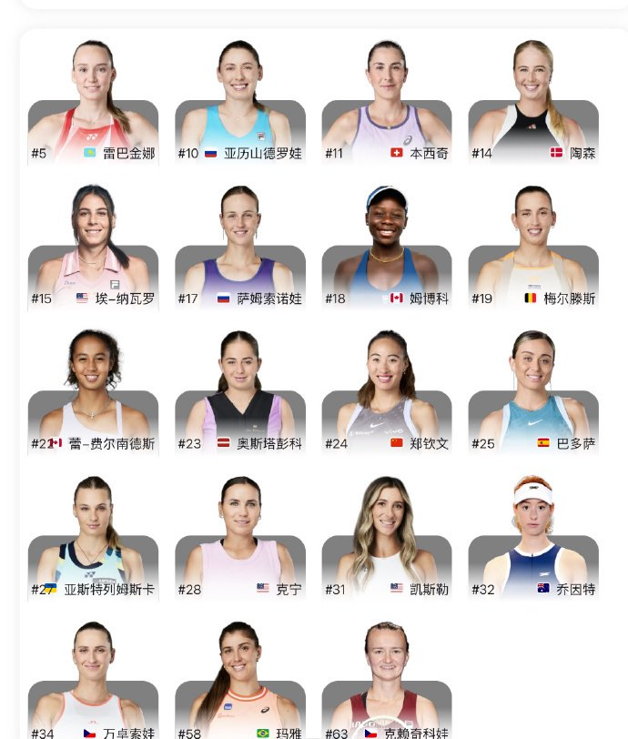从目前阿布扎比的参赛球员来看,整体阵容是相当豪华,除了郑钦文,还有莱巴金娜、亚历山德罗娃、克雷吉茨科娃、本西奇、陶森、纳瓦罗、萨姆索诺娃、姆博科、万卓索娃、梅尔滕斯、费尔南德斯、奥斯塔彭科、巴多萨、雅斯特雷姆斯卡、肯宁、玛雅、凯斯勒等大家非常熟悉的球员。
